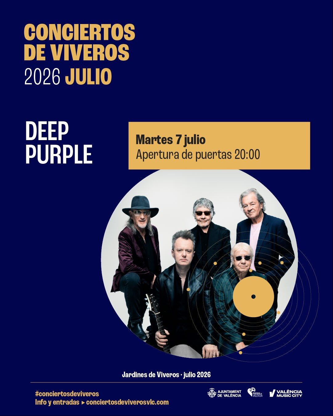 Prepárate para una noche de puro Hard Rock con Deep Purple. El rock de los británicos llega a los Jardines de Viveros de Valencia en 2026 de la mano de la banda que compuso los himnos mas legendarios de los años 70 y 80